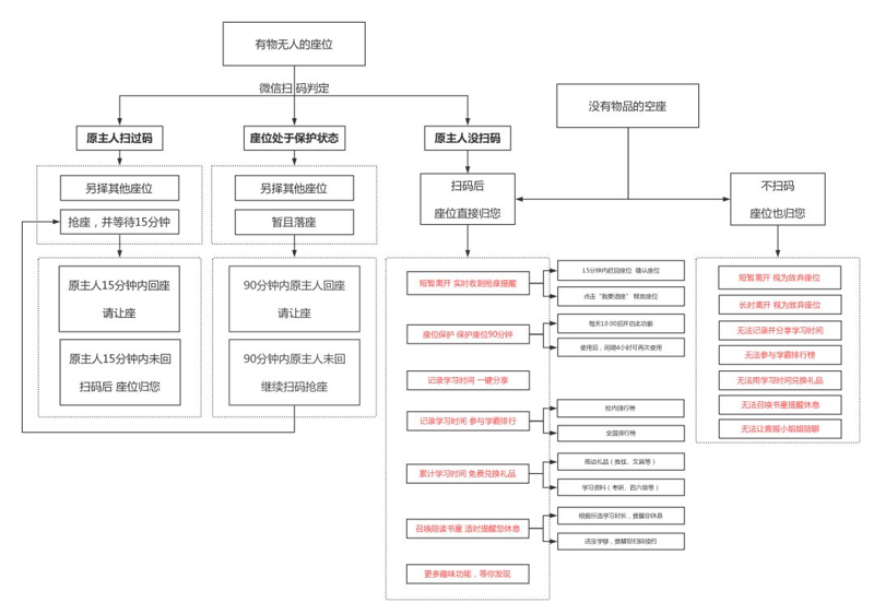 情形1. 發現無物空座,不論是否掃碼,均可直接落座;情形2. 發現有物空座,掃碼,若座位無人,直接落座。若座位有人,點 擊“我要搶坐”(見情形三);情形3. 掃碼后短暫離開,座位保護15分鐘,若15分鐘返回,座位歸屬不變。未回,視為放棄座位;情形4. 掃碼后長時離開,座位保護90分鐘,若90分鐘返回,座位歸屬不變。未回,他人可點擊搶坐。不帶手機也可使用圖書館座位。差別在:不帶手機只可落座無物空座,帶了手機可通過掃碼搶坐有物空座并保護座位。