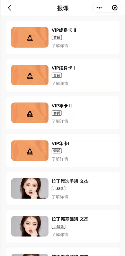 舞蹈培訓約課小程序主要功能,舞蹈培訓機構信息展示、舞蹈課程展示、會員辦卡、課表、團課、精品課、私教、課程簽到、預約課程、掃碼課程簽到、請假停卡、相冊、教師信息介紹等功能。