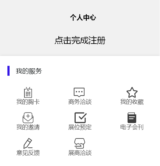 展會小程序觀眾注冊、展會介紹、展商展品、展館分布、同期活動、交通住宿、展商入口、聯(lián)系我們、電子入會碼、展位預(yù)定等。