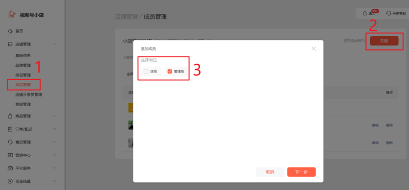 在店鋪管理-成員管理里可以添加管理員、店員,管理員掃碼并在微信端將邀請鏈接轉發給對方,對方接受邀請即可完成綁定,一個視頻號小店可以關聯1000個管理員。