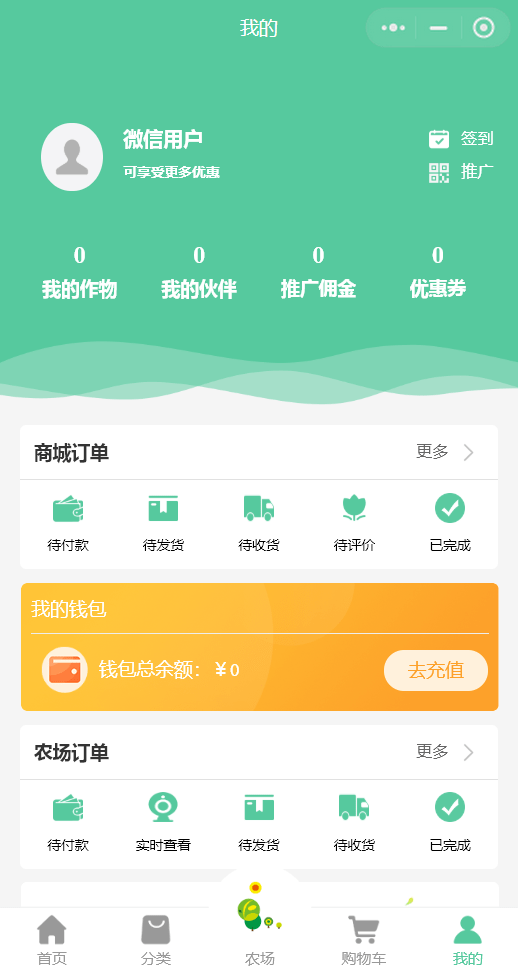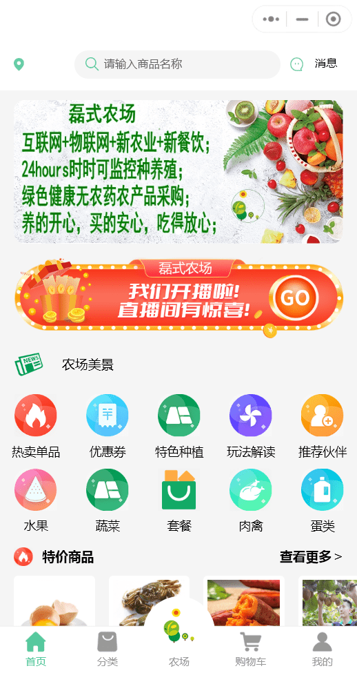 農(nóng)場商城主要功能有:農(nóng)產(chǎn)品信息展示、下單購買、分類、推薦合伙人、優(yōu)惠卷、農(nóng)場主、我的收藏、分銷中心、簽到、農(nóng)場信息展示、直播等功能。