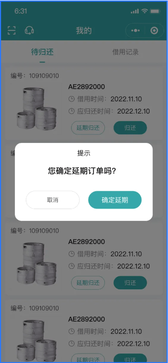 酒桶借用歸還記錄小程序項目主要功能有:用戶注冊登錄、掃一掃、掃一掃發貨、借用記錄詳情、延期歸還、待歸還、待發貨、歸還確認、我的、確認發貨。