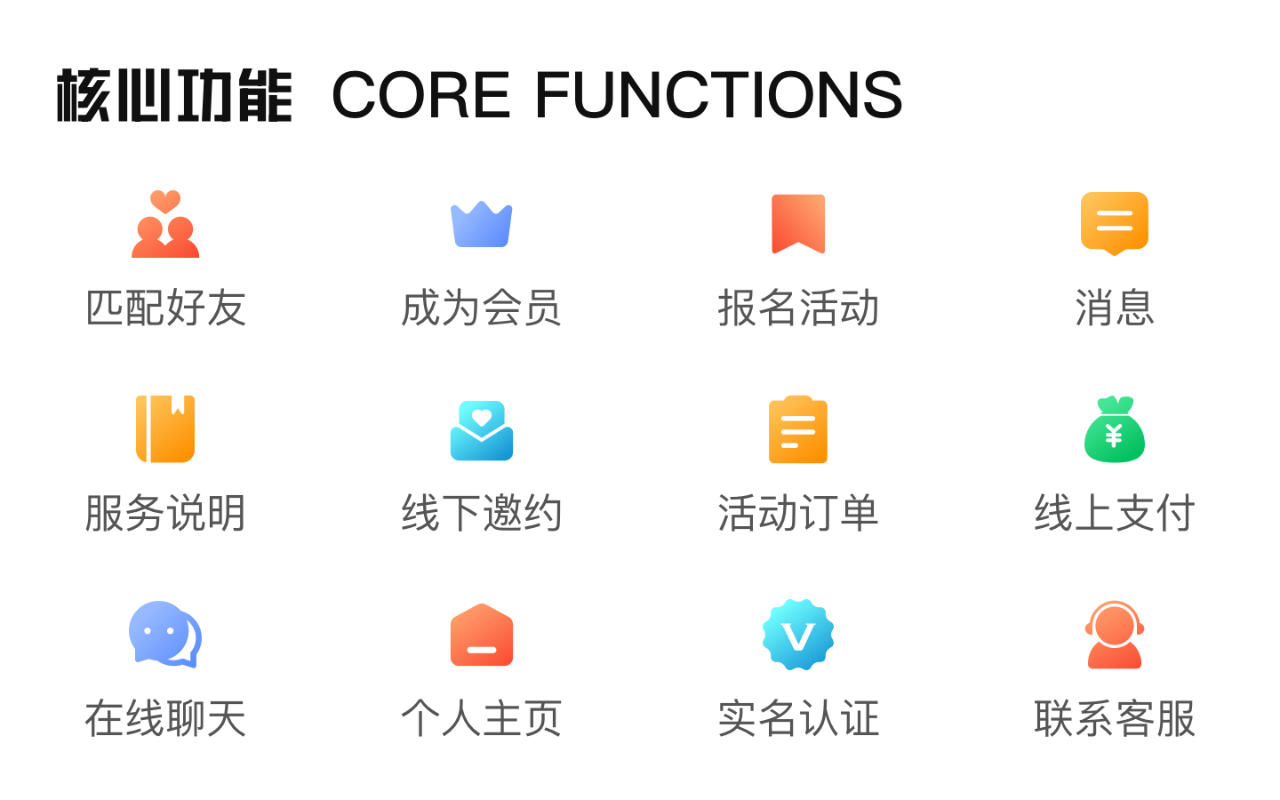 匹配好友、服務說明、在線聊天、成為會員、線下邀約、個人主頁、報名活動、活動訂單、實名認證、消息、線上支付、聯系客服。