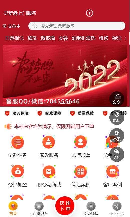 該找家政工人師傅上門服務微信小程序適用于搬家公司使用預約上門搬家搬運服務,預約保姆/月嫂服務,預約房屋維修、家具維修、開鎖/換鎖/修鎖、電腦手機數碼維修、保潔清洗、管道疏通、生活配送等家政服務。可接受定制開發。