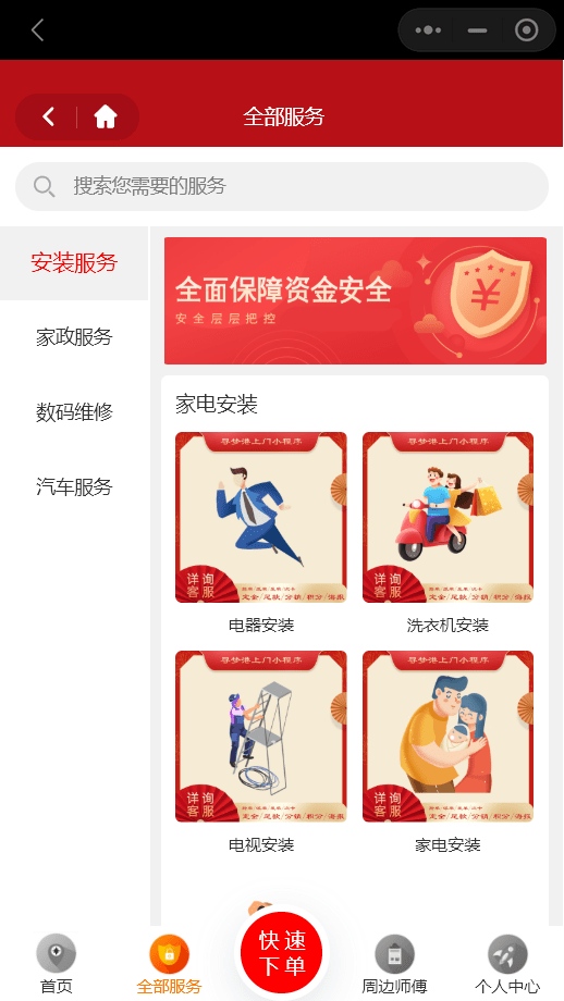 通過微信網上下單找家政工人師傅在線預約上門服務小程序,支持技工師傅們搶單和管理員給工人師傅們進行派單,也可以支持在線購買服務項目進行尾款支付。